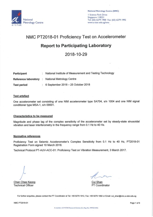 为了落实国家市场监管总局关于国家计量基准须有国际比对数据支持的规定,2018年力学研究所振动实验室启动了与新加坡国家计量中心(National Metrology Centre)的比对计划,在低频振动计量领域展开了频率范围0.1Hz~40Hz包含振动幅值和相位参数的实验室双边比对。2019年05月比对圆满完成。