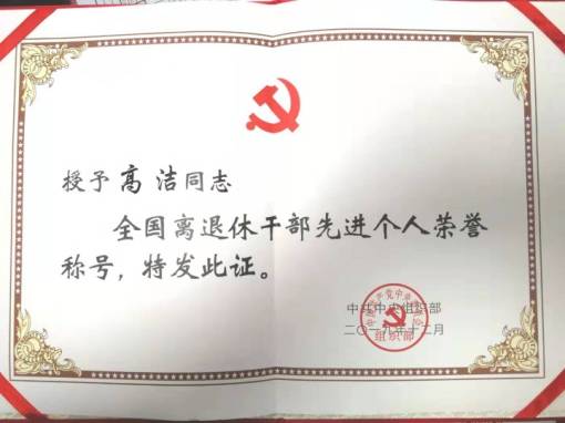 高洁同志荣获“全国离退休干部先进个人”称号